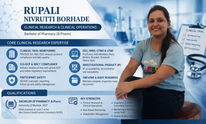 Her background includes significant contributions to Phase II and III trials across APAC regions, with a strong record of supporting FDA inspections, mentoring junior CRAs, and maintaining inspection-ready documentation. Rupali also brings experience from global CROs including Thermo Fisher Scientific (PPD), Veeda Clinical Research, Klinera Global Services, and Tata Consultancy Services.