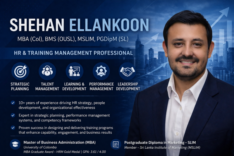 Shehan also brings strong HR and capability development experience, having previously worked as Manager and Assistant Manager – Group Human Resources within the MAS Group. His expertise includes performance management systems, leadership and competency frameworks, organisational governance, policy implementation, and delivering professional development programmes to leaders and employees at scale.